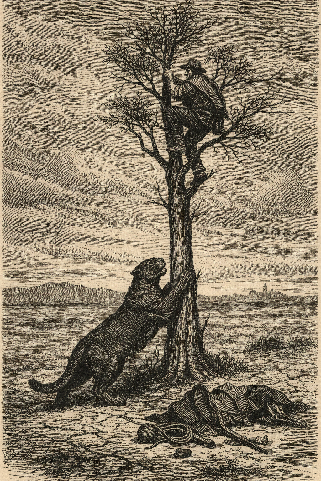 അവസാനം തന്റെ കൈവശമുണ്ടായിരുന്ന പര്യാണവും ജീനിയുമെല്ലാം വലിച്ചെറിഞ്ഞ് അയാള് മുന്നില് കണ്ട വൃക്ഷത്തെ ലക്ഷ്യമിട്ടോടി. ആ മരത്തിന്റെ തായ്ത്തടിക്കു തീരെ ഘനമില്ലായിരുന്നു എങ്കിലും നല്ല ഉയരമുള്ളതായിരുന്നു. അതിന്റെ മുകളിലേക്കയാള്ക്ക് കയറാനായി. അയാള് മുകളിലെത്തിയപ്പോള് വൃക്ഷം ചാഞ്ചാടി. വൃക്ഷശിഖരങ്ങളാല് പാതി മറഞ്ഞ് അയാളിരുന്നു. അവിടെയിരുന്നാല് താനോടിവന്ന വഴികാണാം. അതുവഴി കടുവ തിരക്കിട്ടു വരുന്നതയാള് കണ്ടു. മണ്ണെല്ലാം മണപ്പിച്ചും ഗര്ജ്ജിച്ചുമാണതു വരുന്നത്. തന്റെ ഇര അരികിലുണ്ടെന്ന് ആ കടുവ ആറിഞ്ഞിരിക്കുന്നു. നമ്മുടെ ആട്ടിടയന് പര്യാണമൊക്കെ വലിച്ചെറിഞ്ഞിടത്ത് കടുവയെത്തി. അതിനപ്പുറം എന്തു സംഭവിച്ചു എന്നറിയാത്തതുപോലെ അതവിടെ നിന്നു. പര്യാണവും ജീനിയും അവിടെ കിടക്കുന്നതു കണ്ട് കോപിച്ചു. കടുവ അതില് തന്റെ മുന് കാലുകള് കൊണ്ടതില് ആഞ്ഞടിച്ചു. അതെല്ലാം പലതുണ്ടുകളാക്കി. അന്തരീക്ഷത്തിലേക്ക് വലിച്ചെറിഞ്ഞു. അതെല്ലാം കീറിപ്പോയതതിനെ കൂടുതല് നിരാശനാക്കി എന്നു തോന്നി. ആ നിരാശ പിന്നെയും കോപമായി. ആ വന്യജീവി വീണ്ടും തിരച്ചിലാരംഭിച്ചു. അവസാനം ഇര ഓടിരക്ഷപ്പെട്ട മാര്ഗ്ഗത്തിലേക്കു തന്നെ തിരിച്ചു. തന്റെ ഇര നല്ല ഉയരമുള്ള ഒരു വൃക്ഷത്തില് കയറിയിരിക്കുന്നതു കണ്ടു. ഒരു പുല്നാമ്പിനു മുകളില് വന്നിരുന്ന കുരുവിയെപ്പോലെയാണപ്പോള് അയാള് അവിടെയിരുന്നത്. ആടിക്കളിച്ച്, സമതുലിതാവസ്ഥ നിലനിര്ത്താന് ബുദ്ധിമുട്ടി.