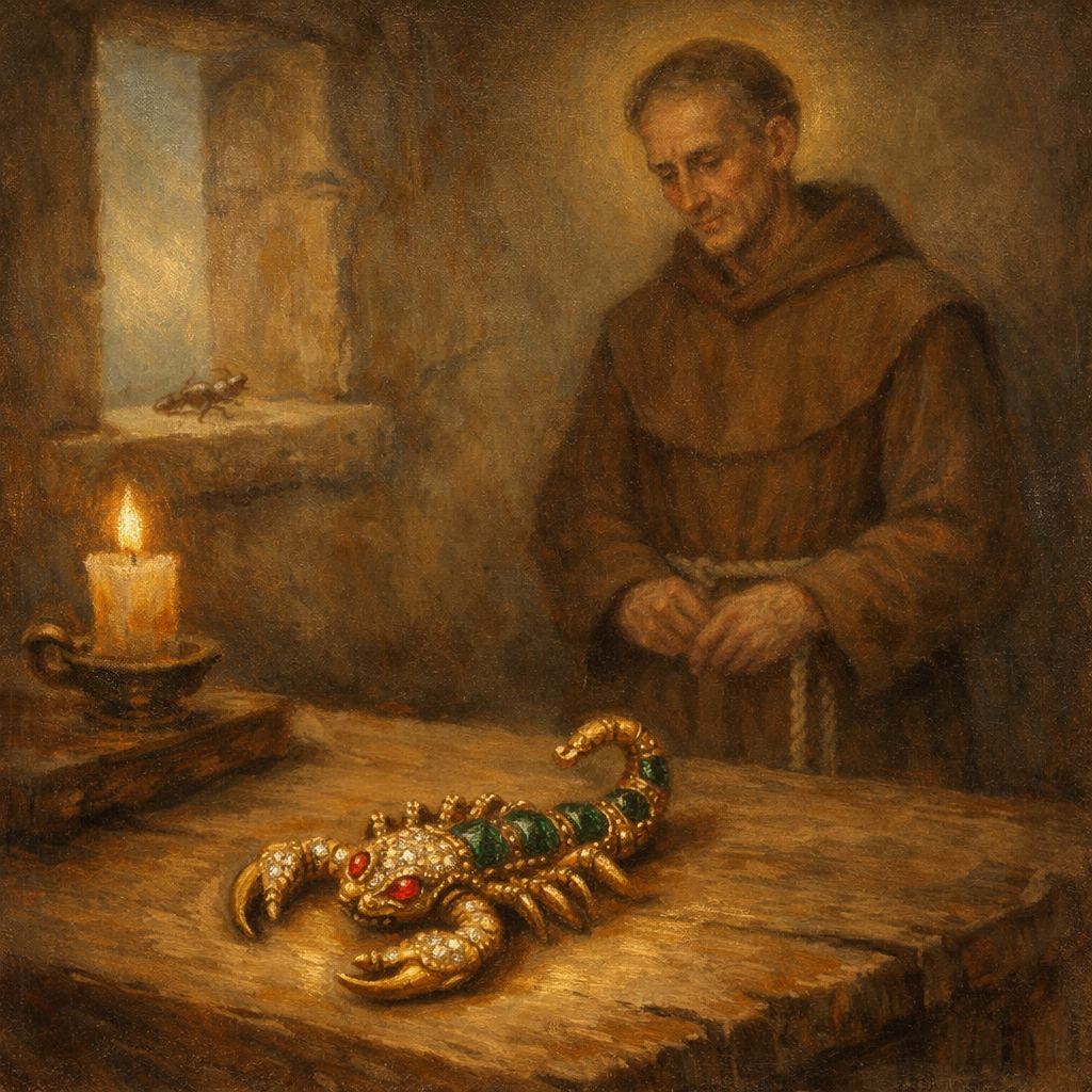 ആ വഴിവാണിഭക്കാരനു നന്ദിപറയാന് വാക്കുകളില്ലായിരുന്നു. അയാള് ഫ്രെ ഗോമസിനോട് യാത്രപറഞ്ഞിറങ്ങി. നേരെ ചെന്നത് പണമിടപാടുകാരനരികിലേക്കാണ്. ആ ആഭരണം അതിഗംഭീരമായിരുന്നു. ഒരു മഹാറാണിക്ക് യോജിക്കുന്നത്. തേളിന്റെ ആകൃതിയിലുള്ള ഒരു പതക്കമായിരുന്നു അത്. സ്വര്ണ്ണത്തില് മരതകം പതിച്ചത്. അതിന്റെ തല തിളങ്ങുന്ന രത്നം കൊണ്ടായിരുന്നു. കണ്ണുകള്ക്ക് പകരം പവിഴക്കല്ലുകള്.