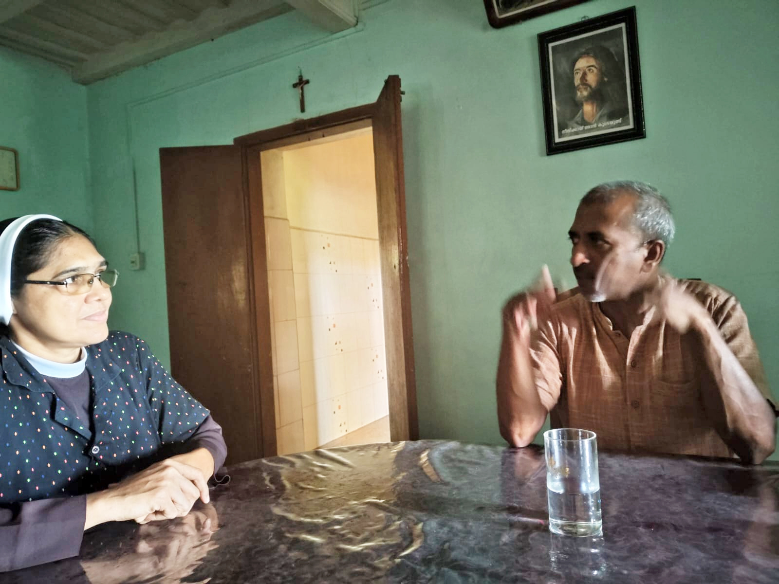 At the terrace was a Cross overlooking the Convent. We recorded the sisters as they talked, sat discussing, joked, asked doubts and walked across its length with a resigned familiarity with their place. When Sister was settled, in an unplanned gesture Joshy Joseph sat her down in a chair, sat himself down on a low cement structure near and prepared her for the only conversation that enveloped her ever in our visit..lt was at the 24th hour of the 24 hour shoot, about her life and predicament. A visibly distraught expression but one of cooperation was on her face. “When you once said, ‘Winning or losing it is a Cross (kurishu) to me’ what did you mean Sister ?”Joshy asked. She was lost for an answer. Writhng agony was spreading in her consciousness. He warmly brought a closure to the evening, the endeavour and event saying “A transfer is all you had asked in the beginning isn’t it ?” She held back from breaking down, yet tears rolled down her shaking face and said “if only I knew what might of the system was in store for me when I entered it, I probably would not have ventured to fight it. I thought it was justice I would get, but we got crushed.” Joshy’s eyes welled up on seeing and hearing her distressed reality, articulated in earnest helpless defeat. “I am going to withstand and continue, now that it has brought me to this” she said.