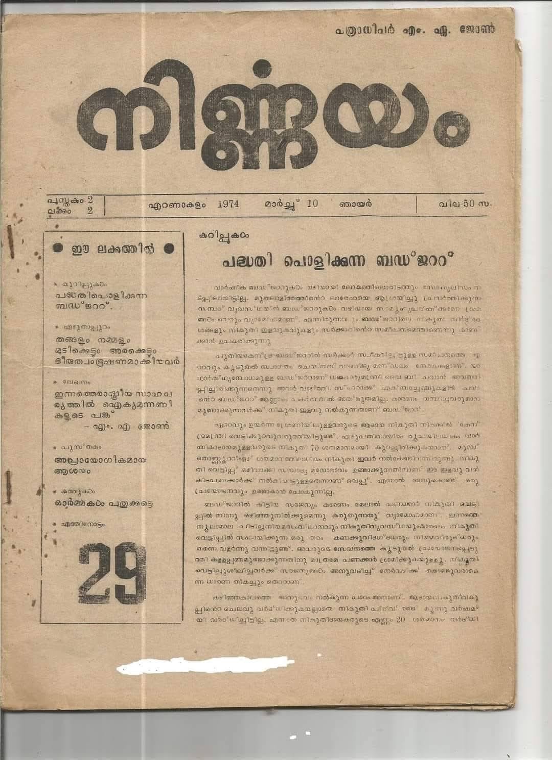 ‘വായിക്കുവാനും ചിന്തിക്കുവാനും ചോദ്യം ചെയ്യാനും സ്വന്തമായ നിലപാടുകള് രൂപീകരിച്ച് അതില് ശക്തമായി ഉറച്ചുനില്ക്കുവാനും ഉള്ള ആര്ജ്ജവം’ പൊതുസമൂഹത്തിനും സതീര്ഥ്യര്ക്കും അന്ന്(ഇന്നും) പൂര്ണ്ണമായും മനസ്സിലാവാതിരുന്നതാവണം ആ തകര്ച്ചയ്ക്ക് കാരണം. 1975ല് അടിയന്തരാവസ്ഥയ്ക്കെതിരായി എം.എ. ജോണ് എഡിറ്റര് ആയുള്ള നിര്ണ്ണയം എന്ന മാധ്യമം ‘ഇന്ദിരയുടെ അടിയന്തിരം’ എന്ന ലേഖനം പ്രസിദ്ധീകരിക്കുകയും അതേത്തുടര്ന്നുണ്ടായ സംഭവബഹുലമായ നാളുകള്ക്ക് ശേഷം അദ്ദേഹം അറസ്റ്റ് ചെയ്യപ്പെടുകയും ചെയ്തു. ‘