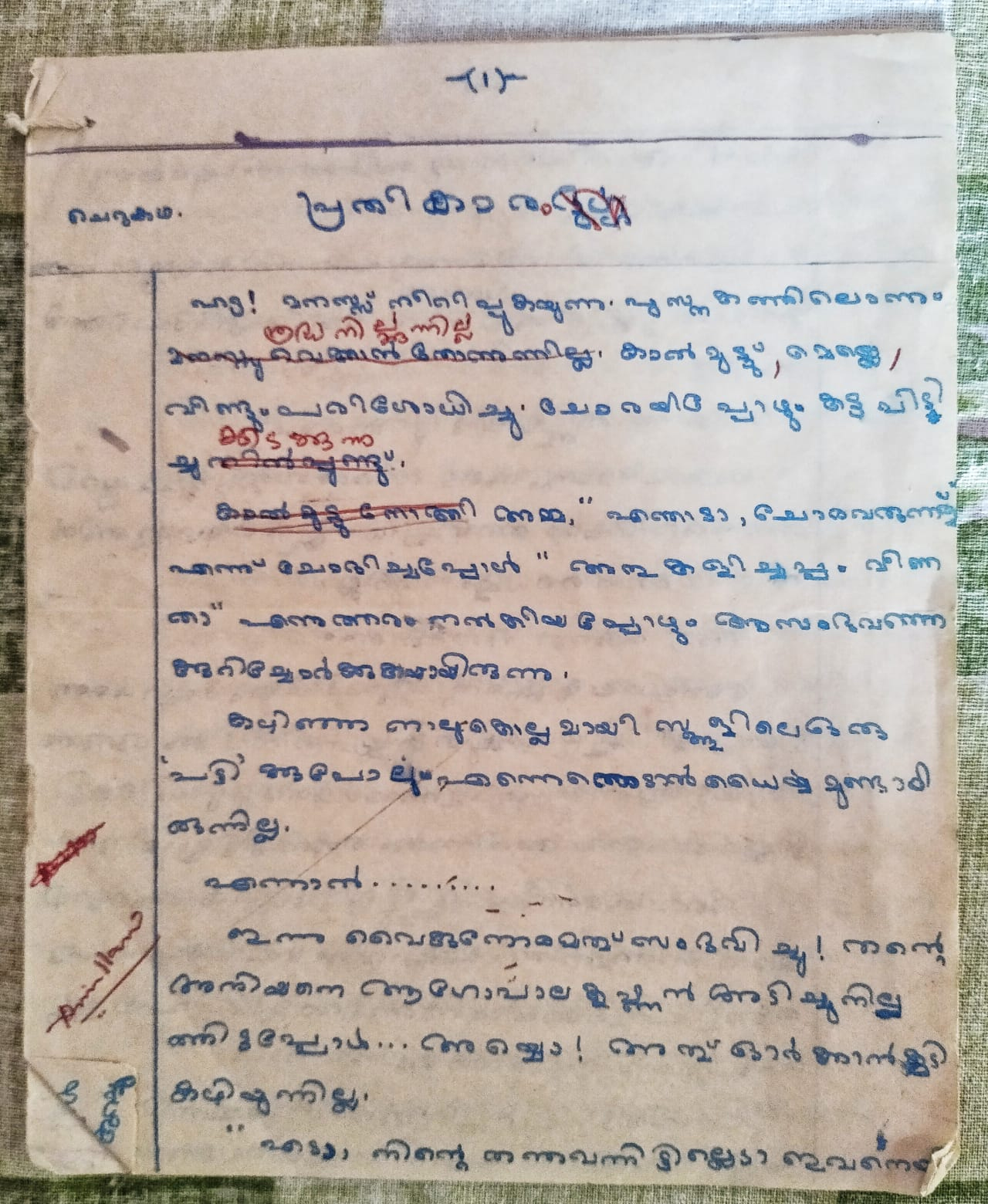 ആദ്യകാലത്തെ കുറെയേറെ കഥകൾ, എഴുതിക്കഴിഞ്ഞാൽ അച്ഛന് വായിക്കാൻ കൊടുക്കുക്കാറുണ്ട്. പലപ്രാവശ്യം ചെന്ന് ചോദിച്ചാലും അച്ഛൻ അത് വായിച്ചു കഴിഞ്ഞിട്ടുണ്ടാവില്ല. കഥയെപ്പറ്റി എന്തുപറയും എന്ന വേവലാതി കൊണ്ട് ഞാൻ, അതിനെപ്പറ്റി ചോദിക്കുന്ന കാര്യത്തിൽ നിന്ന് എപ്പോഴും മാറി നിന്നു. ഒരു കഥ എഴുതിയാൽ ഒന്നു രണ്ടുമാസം ചിലപ്പോൾ അച്ഛൻ്റെ കൈയ്യിൽ തന്നെയായിരിക്കും.ആദ്യത്തെ കഥയുടെ കൂടെ “ഊന്ന്” എന്ന മറ്റൊരു കഥ കൂടി എഴുതിയിരുന്നു. “പ്രതികാരം” കൊള്ളാമെന്നും “ഊന്ന്” കൊള്ളില്ലെന്നും അച്ഛൻ പറഞ്ഞു. മറ്റൊരിക്കൽ ഒരു നീണ്ടകഥ എഴുതിയിട്ട് അച്ഛനെ കാണിച്ചപ്പോൾ ആരെയും അനുകരിച്ച് എഴുതരുത് എന്ന് നിർദ്ദേശവും തന്നു. ആ കഥ ഞാൻ വെളിച്ചം കാണിച്ചില്ല. പക്ഷെ ഇപ്പോഴും എൻ്റെ കയ്യിൽ അതുണ്ട്. ഒന്നാമത്തെ കഥയുടെ കൈയ്യെഴുത്ത് പ്രതി, ചുവന്ന മഷി കൊണ്ട് അച്ഛൻ്റെ തിരുത്തലുകളോടെ ഞാൻ സൂക്ഷിച്ചു വച്ചിട്ടുണ്ട്. ഇപ്പോഴീ ഫോണിൽ എഴുതുന്ന കാലത്തെ കഥകളൊഴിച്ച് ബാക്കി എല്ലാറ്റിന്റെയും കയ്യെഴുത്ത് പ്രതികളും അച്ചടിച്ച പേജുകളും ഞാൻ സൂക്ഷിച്ചു വച്ചിട്ടുണ്ട്. ആറു വർഷത്തെ പ്രണയത്തിനു ശേഷം സാവിത്രി ടീച്ചറുടെ വരവോടെ ആദ്യവായനക്കാരിയും കഥയിലെ തിരുത്തൽ ശക്തിയും അവരായി! അതാണ് പറഞ്ഞത് എനിക്കല്ലാതെ ഇത് മറ്റാർക്കും ഇതൊന്നും ഒരു വിഷയവുമല്ല.