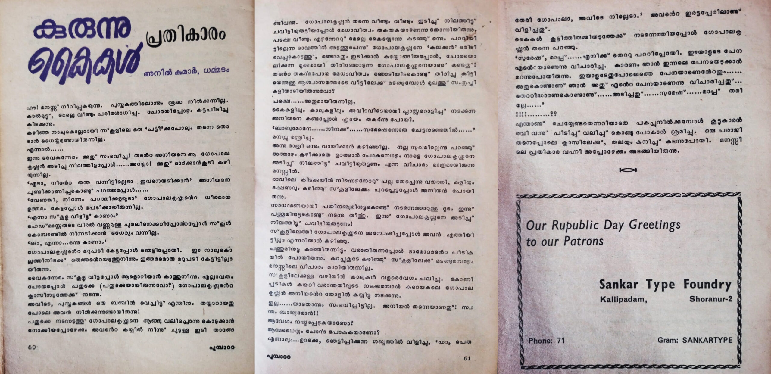 അടുത്തമാസം തന്നെ അത് അച്ചടിച്ചു വന്നു. 1972 ഫെബ്രവരിയിൽ വന്ന “പ്രതികാരം” എന്ന ആ കഥയാണ് എൻ്റെ പ്രസിദ്ധീകരിക്കപ്പെട്ട ആദ്യകഥ. അങ്ങനെയെങ്കിൽ ഇത് കഥ എഴുത്തിന്റെ 53ആം വർഷമാണ്. തീർച്ചയായും അതൊരു ചെറിയ കാലമല്ല.