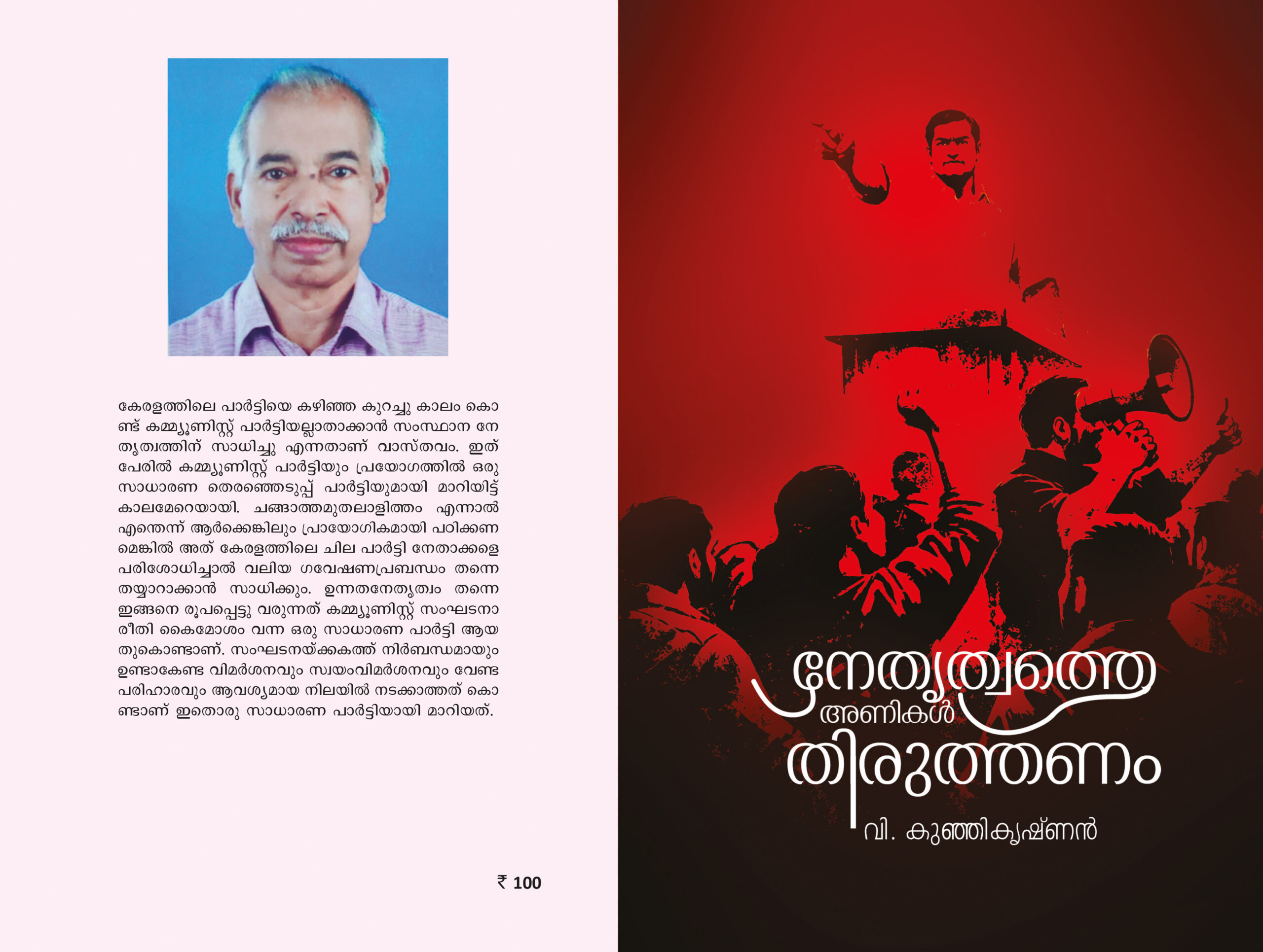 സഖാവ് വി. കുഞ്ഞികൃഷ്ണന്റെ ‘നേതൃത്വത്തെ അണികള് തിരുത്തണം’ എന്ന ഈ പുസ്തകം വായിച്ചപ്പോള് ഇതിന്റെ മൊത്തത്തിലുള്ള ഒരു ഭാവം, ഇതിലെ ആന്തരികമായ വികാരം എന്നത് ഒരു ആക്രോശമല്ല. തന്റെ എതിര്പ്പുകള് മുഴുവനും പറഞ്ഞു കുപിതനാവുന്ന രീതിയല്ല. 50 വര്ഷമായി ഒരു രാഷ്ട്രീയ കക്ഷിയില് വിശ്വസിക്കുകയും പ്രവര്ത്തിക്കുകയും, അതിനുവേണ്ടി ആത്മാര്ത്ഥതതയോടെ പ്രവര്ത്തിക്കുകയും ചെയ്ത ഒരു സഖാവ് പാര്ട്ടിയുടെ തെറ്റുകളെ ചൂണ്ടിക്കാണിച്ചപ്പോള്, പാര്ട്ടി വഴിതെറ്റുന്നു എന്ന് തെളിവുകള് സഹിതം പറഞ്ഞപ്പോള് ഉണ്ടായ പരുക്കുകളില് വേദനിക്കുന്നത് പോലെയാണ് തോന്നിയത്. തീര്ച്ചയായും ആ വേദന ഉണ്ടാകും. തന്റെ പ്രയത്നം തന്റെ സദുദ്ദേശം, ഇങ്ങനെ പാഴായിപ്പോകുന്നല്ലോ എന്നതാണ് ആ വേദനയ്ക്ക് നിദാനം.