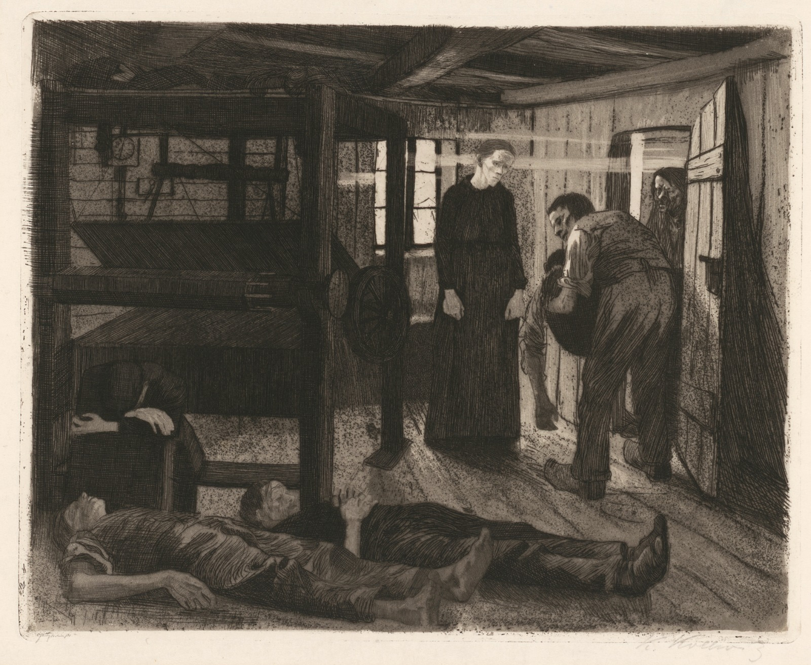1890 -കളുടെ തുടക്കത്തിൽ കാത്തെ ജർമ്മനിയിലെ ദുരിതമനുഭവിക്കുന്ന നെയ്ത്തുതൊഴിലാളികളുടെ കലാപഭരിതമായ ജീവിതം വിഷമായുള്ള ഒരു നാടകം കാണാനിടയായി. പ്രശസ്തനായ ജർമ്മൻ നാടകകൃത്ത് ജർഹാർട് ഹോപ്ട്മാന്റെ (Gerhart Hauptmann) ‘The Weavers’ എന്ന നാടകമായിരുന്നു അത്. 1844 -ൽ കൂലിവർദ്ധനവിനും മാന്യമായ ജീവിതസാഹചര്യങ്ങൾക്കും വേണ്ടി ജർമ്മനിയിലെ തുണിമില്ലുകളിലെ തൊഴിലാളികൾ തൊഴിലുടമകൾക്കെതിരായി നടത്തിയ ഐതിഹാസികമായ സമരങ്ങളായിരുന്നു ആ നാടകത്തിന്റെ പ്രമേയപരമായ പശ്ചാത്തലം. നാടകം കാത്തെയെ ആഴത്തിൽ സ്പർശിച്ചു. തുടർന്ന്, ഏറ്റെടുത്തിരുന്ന മറ്റുചില ജോലികൾ മാറ്റിവച്ച് അവർ നെയ്ത്തുകാരുടെ ജീവിതവും സമരങ്ങളും ചിത്രീകരിക്കുന്ന ഒരു ചിത്രപരമ്പരയ്‌ക്കു തുടക്കംകുറിച്ചു. ലിത്തോഗ്രാഫ് പ്രിന്റുകളും എച്ചിങ്ങുകളും ചാർക്കോൾ ഡ്രോയിങ്ങുകളുമെല്ലാം ഈ പരമ്പരയുടെ ഭാഗമായി വരുന്നുണ്ട്. 1893 – 97 കാലഘട്ടത്തിൽ ചെയ്ത വികാരതീക്ഷ്ണമായ ഈ ചിത്രപരമ്പര “Weavers’ revolt’ പരമ്പര എന്നാണ് പൊതുവിൽ അറിയപ്പെടുന്നത്. ആ പരമ്പരയുടെ ഭാഗമായുള്ള അനേകം ചിത്രങ്ങളിൽ ഏതാനും ചിലതാണ് ഇവിടെ ഈ കുറിപ്പിനോടൊപ്പം എടുത്തുചേർത്തിട്ടുള്ളത്.