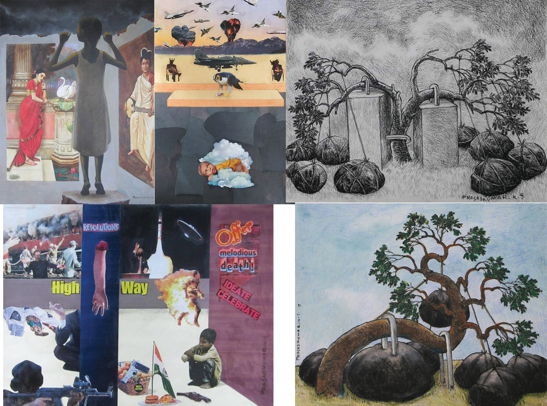 ആദ്യം അദ്ദേഹത്തിൻ്റെ കൊളാഷ് ചിത്രങ്ങളെക്കുറിച്ചാണ് എഴുതുന്നത്. യുദ്ധത്തിൻ്റെയും സംഘർഷത്തിൻ്റേയും അനേകം ബിംബങ്ങളുള്ള ചിത്രങ്ങളിലെല്ലാം, ദൃശ്യശ്രാവ്യാനുഭവങ്ങളെ വിവേചനാറിവുകളോടെ വ്യവസ്ഥപ്പെടുത്തിയിരിക്കുന്നതാ