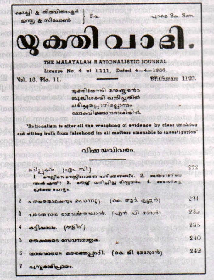 തൊട്ടടുത്തവര്ഷം 1927ല് തന്നെ സംഘടനയ്ക്ക് ഒരു മുഖപത്രം വേണമെന്ന് തീരുമാനിക്കുകയും അതിനായി ‘യുക്തിവാദി’ എന്നപേരില് കോഴിക്കോട് നിന്നും ഒരു മാസിക ആരംഭിക്കാനും. അത് മിതവാദി പ്രസ്സില് അച്ചടിക്കാനും തീരുമാനിക്കുകയും അതിന്റെ പോസ്റ്റല് രജിസ്ട്രേഷനും ലൈസന്സിനും മറ്റു കാര്യങ്ങള്ക്കും ഒക്കെയായി കൃഷ്ണന് വക്കീലിനെ ചുമതലപ്പെടുത്തുകയും ചെയ്തെങ്കിലും പലകാരണങ്ങള് കൊണ്ട് അത് നീണ്ടുപോകുകയും അവസാനം രണ്ടുവര്ഷത്തിന് ശേഷം സഹോദരന് തന്നെ മുന്കൈ എടുത്ത് 1929 മുതല് എറണാകുളത്ത് നിന്നും പ്രസിദ്ധീകരിച്ച് തുടങ്ങുകയുമായിരുന്നു എന്ന് എംസി തന്നെ എഴുതിയിട്ടുണ്ട്, അതിനേക്കാള് വലിയ ആധികാരിക തെളിവാണോ മറ്റേ പുസ്തകം?